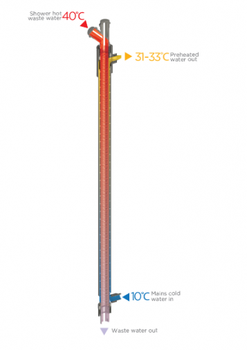 Tan sencillo como los demás modelos: el agua caliente de la ducha se redirige para ayudar a precalentar el agua fría.