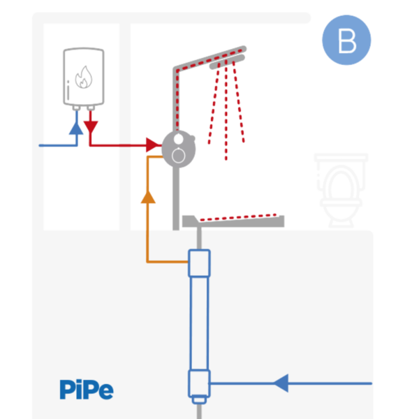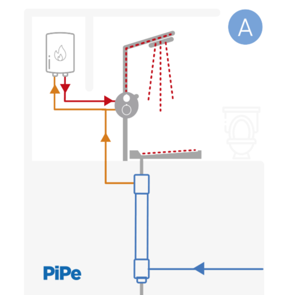 El calor se transfiere del agua caliente residual de la ducha a la red fría de suministro. Esta agua caliente puede dirigirse al grifo de la ducha, al calentador de agua o a ambos.