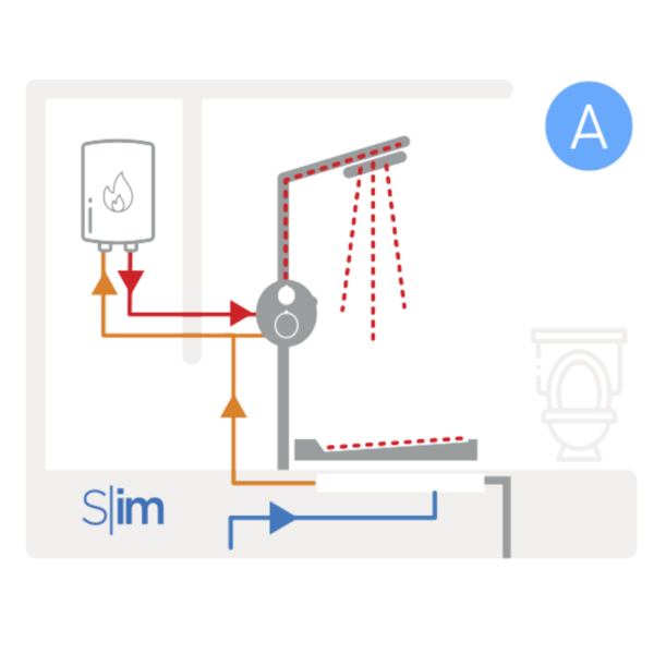 El calor se transfiere del agua caliente residual de la ducha a la red fría de suministro. Esta agua caliente puede dirigirse al grifo de la ducha, al calentador de agua o a ambos.